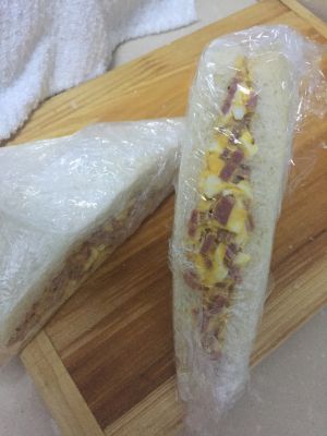 将拌匀的火腿蛋沙拉,平铺在一片吐司上,再将另一片吐司盖在一起即可。