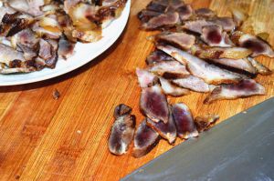 将蒸好的腊肉切成薄片,摆入盘中,用醋蘸食。