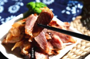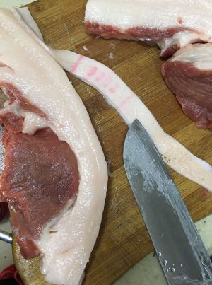 将猪后臀肉洗净,切成1.5公分左右的厚度,然后去皮;(最好买肉的时候让老板去掉)喜欢吃瘦一点的,也可以换成纯瘦肉!