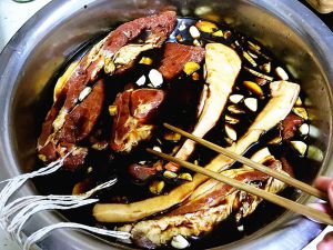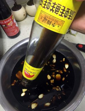 配制酱汁:将准备好的料酒,酱油,蚝油,陈醋,盐,白糖,大蒜、生姜片,胡椒粉倒入面盆中,充分搅匀;