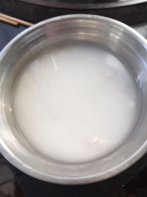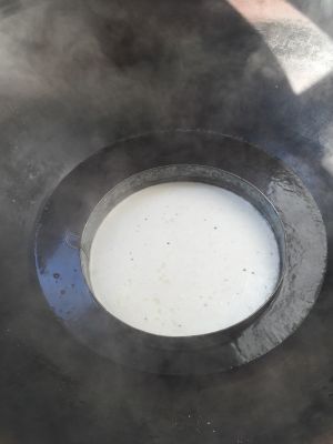 粉扇上倒进少许油,把搅好的淀粉放进去,能把盘底摊平。直到淀粉凝固不在流动。