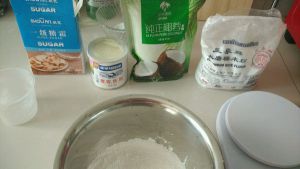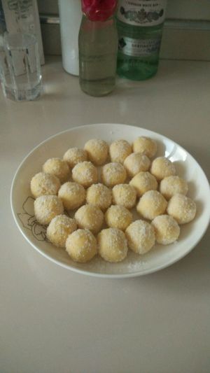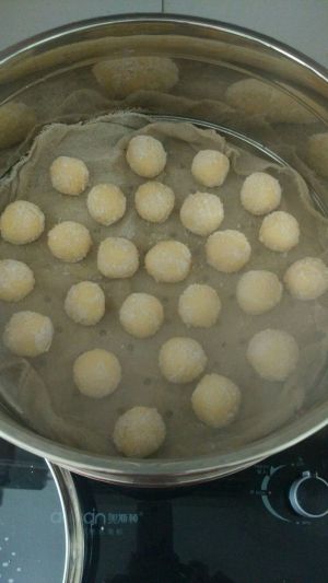 用手搓成丸子沾上椰蓉,大小8g~10g的重量刚好,蒸的时候会更大些的