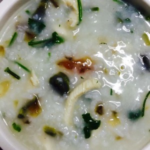 锅里水烧开,放入大米,小火慢慢煮,煮到米开花,放入鸡胸肉,(不喜欢吃生姜的可以把生姜下锅前挑出来)搅拌至发白,倒入皮蛋丁,慢慢搅拌,三五分钟即可出锅,出锅前可加入适量的盐,香油,放入香菜香葱,搅拌均匀出锅,自己家做的比外面的料足,当然好吃了,也没有太多乱七八糟的调料。