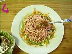 素菜铺底,再铺上鸭肉丝,浇上调味汁,吃前拌匀即可。