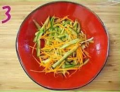 黄瓜、胡萝卜切细丝,胡萝卜丝用开水烫过,充分沥干水分;