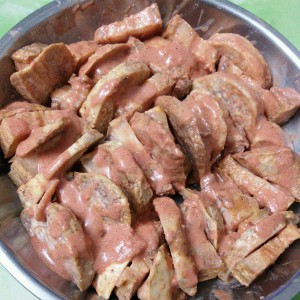摆好后,将剩余的南乳汁倒在表面上,用保鲜袋包起来,放进冰箱腌制一晚上。