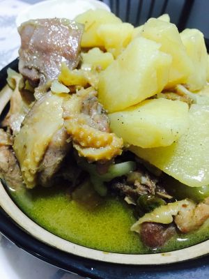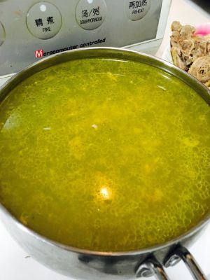乡下土鸡唯一的独特特点就是熬出来的汤水上面是飘着黄黄的鸡油!捞出鸡块!汤水分出来!留着一会备用