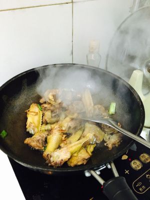 热油起锅!把葱姜放到锅里爆香,把鸡块入锅翻炒!炒的锅里面开始噼里啪啦的(油烹的都烫我胳膊了)声音有点微微糊就马上把一旁刚刚的鸡汤倒入锅内