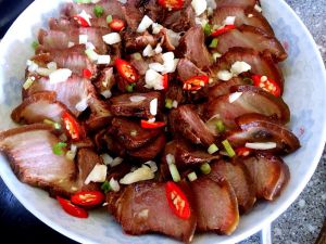 腊肉装盘,撒上蒜粒,椒粒。