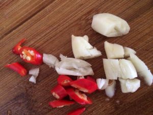 葱,蒜,米椒切碎,取出腊肉切片。