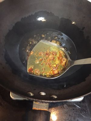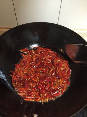 待辣椒炒至外壳变硬放入花椒继续翻炒。