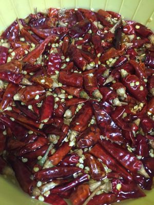 把辣椒、花椒用凉水浸泡30分钟(侵泡到辣椒滋润为止,注意辣椒一定要用剪刀剪破)