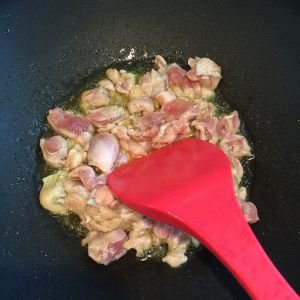 下油烧热,选放入鸡腿肉炒一下,加入少许老抽上色,然后盛出沥干油备用