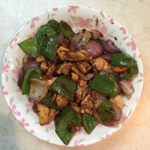 先加入蒜爆香,再依次加入青椒 洋葱 炒过的鸡腿肉,最后加一勺豆豉和少许水即可出锅