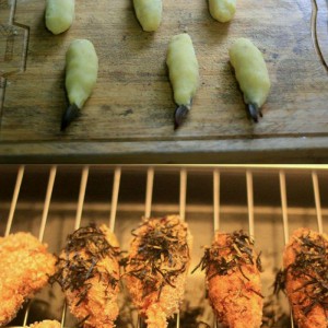 处理好虾,土豆泥估计不是很烫了,搓成椭圆形,用手指压成像图中那样,把处理好的虾包进去。