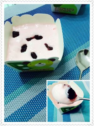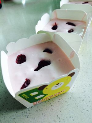 为了美观,也为了让小朋友吃得开心,我把一部分冰淇淋溶液用勺子盛入一次性蛋糕纸杯中,最后撒上蔓越梅。