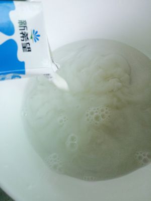 找一个大器皿,我用的是特大号汤盆,把凉白开和牛奶混合。