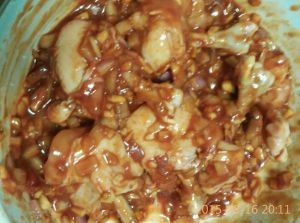 剁点儿圆葱碎~四分之一的苹果或者梨用梨最好哈~我家里没有梨了~放到盆里~加入甜辣酱~少许番茄酱和蚝油~以及料酒~一点儿油~把处理好的鸡翅根放到腌料里多抓会儿~然后放到冰箱冷藏腌制最少半小时以上~我晚上腌的~早起烤~很入味儿