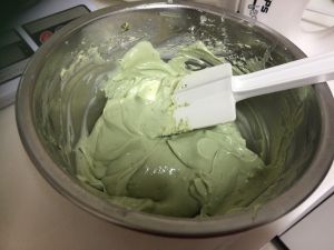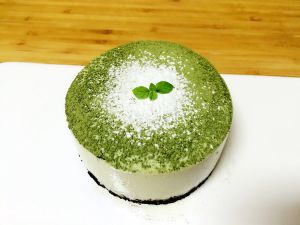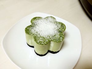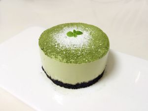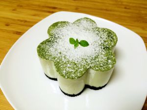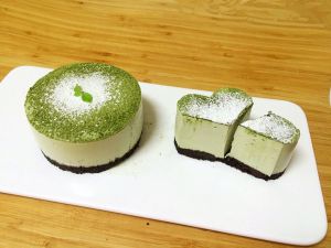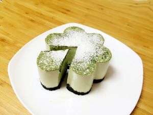 将135g的奶油奶酪放置室温软化,加入45g白糖用电动打蛋器打至顺滑。加入100g豆腐和5ml抹茶粉。