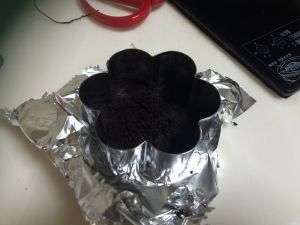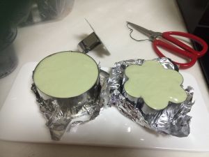 在磨具底部铺上油纸。将黄油奥利奥饼干碎均匀地铺在六寸的蛋糕模中或2个四寸的模具中,用小勺子将底部饼干压实,放入冰箱冷藏。(我用的是2个4寸慕斯模,没有底所以用锡纸打底。)