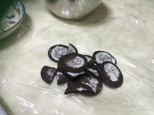 取五块奥利奥去夹心,也就是10块单片的黑色饼干(也可以用5块消化饼干代替)。掰成小块后,放入料理机中打成粉,或直接擀面杖敲碎成渣渣。