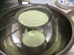将豆浆液放凉至室温后,加入奶油奶酪糊中,用刮刀搅拌混合。然后过筛,使芝士糊顺滑细腻!