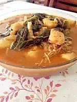 4;然后将准备好的土豆放入骨头锅中。顺次放入腌制好的干菜。