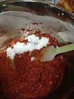 2:将大蒜、洋葱、糖、最好放一根尖椒,在一起打成碎末,然后跟辣椒粉一起搅拌,加入姜粉。