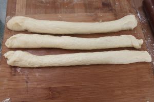 将面团分成两份,每一份分成三小份,开始拧麻花前的操作,将一个面团擀开成长方形,从上往下卷起。卷成一个小圆条。