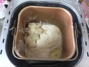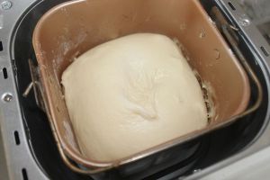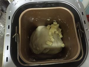 在面团中加入20克黄油。继续开启面包机的发面程序。我这个面包机发面程序,是连揉面带发面一起的,所以可以将黄油自动揉到面团里。时间大概58分钟。