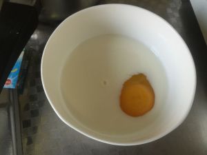 碗中倒入65克牛奶,然后把鸡蛋加入到牛奶中打散。