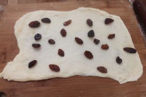 另半个面团,我两股加了点葡萄干,一股中加了豆沙,所以就是豆沙葡萄干的面包。就是在长面片上洒葡萄干,然后卷起。最后也是拧麻花。放另一个吐司模中。