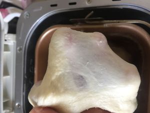 20分钟揉面后,检查一下面团出膜情况。没出膜的话再多揉一会儿或者用手摔打一会儿,我这个出膜了,可以进行下一步了。