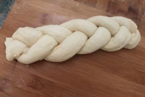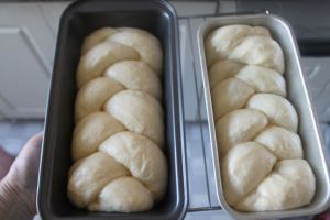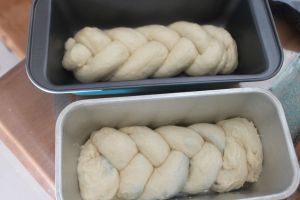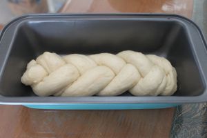 将一根大麻花移步到长条吐司模中。