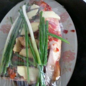 上面摆上老姜小葱,弄一点蒸鱼豉油!包上保鲜膜上锅蒸!半个小时