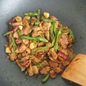 3.在放入猪肉翻炒至变色时,加入老抽(酱油)、盐、鸡精(适量)。
