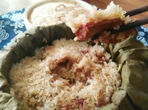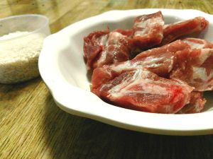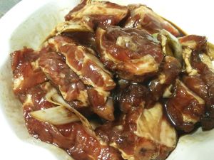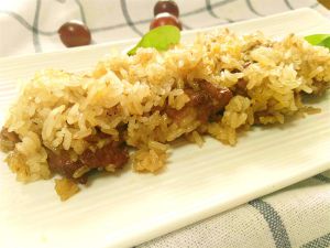 5、排骨中放入生抽、老抽、料酒、少量盐、适量蜂蜜,用手抓匀,盖上保鲜膜,放入冰箱中腌制一晚。将腌制好的排骨放入去水的糯米中,加入少量的橄榄油,搅拌使排骨粘上糯米