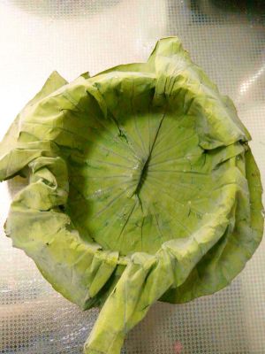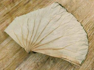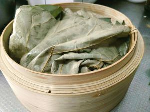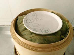 在蒸笼上放置装有水的盘子,将荷叶压紧