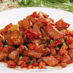倒入羊肉翻炒片刻,撒入辣椒粉、孜然粉炒均匀。