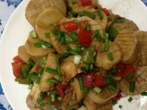 再下杏鲍菇回炉,翻炒一下,放耗油,下青,红辣椒配色