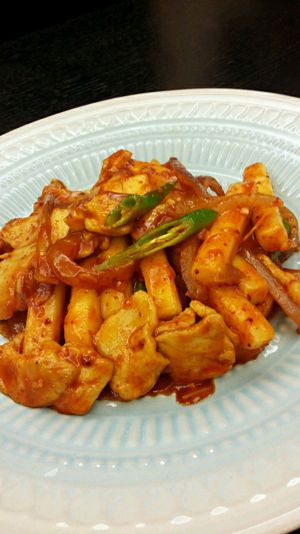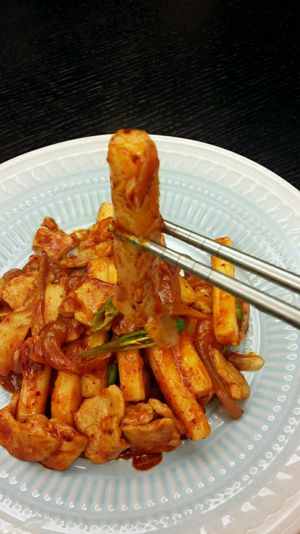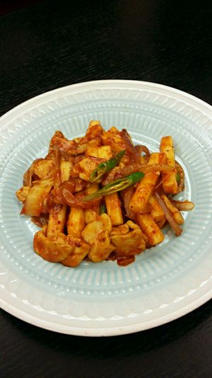 放入年糕和适当的清水,再加入调好的酱汁和泡菜,煮沸收汁,起锅前放入切好的尖椒翻炒几下即可