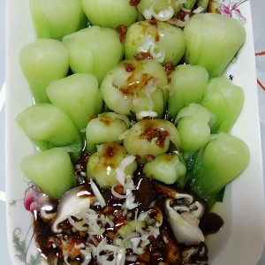 把焯好的油菜摆盘,焯好的香菇也摆在同一个盘子里