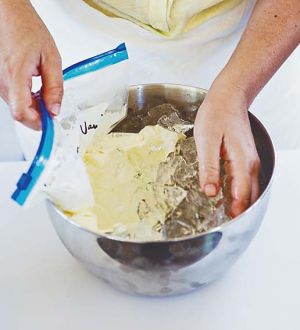 将混合物倒入约4 升大的密保诺密封塑料袋中,将密封袋浸入冰块浴中,保持竖立,必要时加入更多冰块直至冷却,冷却大约30 分钟。