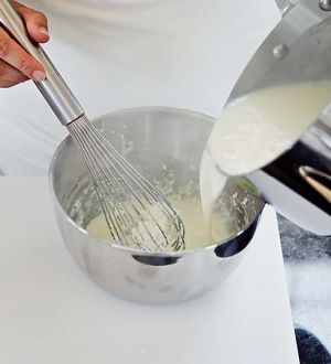 一边搅拌一边缓缓将热牛奶混合物倒入中号碗的奶油奶酪中,并搅拌至顺滑。