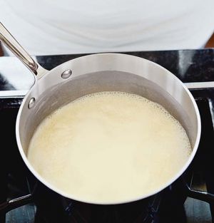 准备一个约4 升大的汤锅,将剩下的牛奶、奶油、糖和玉米糖浆加入其中,用中高火煮至沸腾,并继续煮4 分钟。离火,加入咖啡粉浸泡5 分钟。