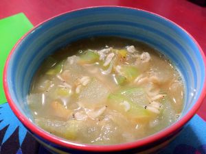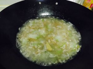 姜切个三片,冬瓜去皮切片,一把海米~,热锅少油,加入姜片爆香一下在加入海米炒香一下,然后加入冬瓜片翻炒一下,加入开水,改小火炖煮一会儿。