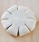 用剪刀先剪3.6.9.12点钟的位置,然后剪其余4刀,然后放入烤箱,不开火。地下放一杯热水,发酵至40分钟左右,至两倍大。取出刷全蛋液。烤箱预热160度。中层,上下火,18-20分钟左右。