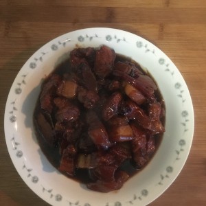 加入热水,要抹过肉多一些,大火烧开,改小火慢炖40分钟左右。加水的图片忘记拍了,这是烧了有一段时间拍的,嘻嘻!