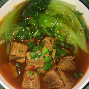 热锅凉油,放入豆瓣酱炒出红油,注意火不要太大以免炒糊。再放入出香葱以外的所有料,炒出香味,放入牛肉混合均匀。加入开水,切记不可放冷水。