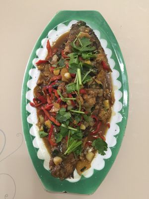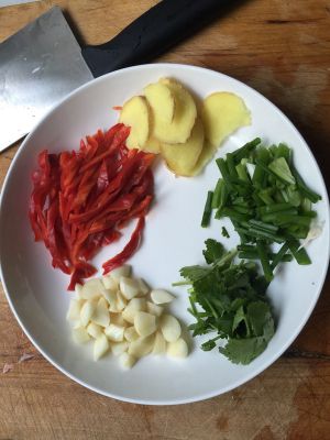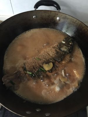 添水没过鱼,把生姜,大蒜,葱,放进去,加耗油,生抽和盐,调好味以后就可以炖了,快收干的时候放红辣椒进去!(调味这个事情,别迷信别人的量,自己边调边尝,自己觉得合适就行!)